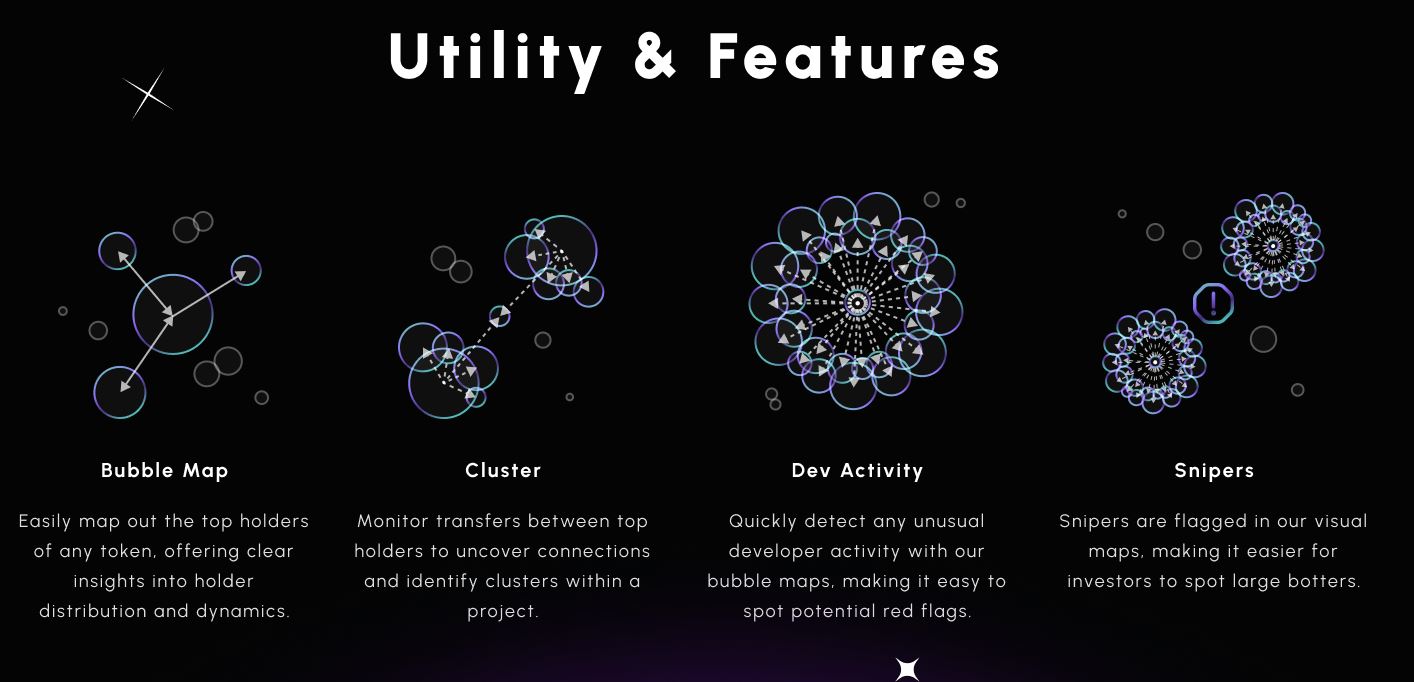 [The Vizion App](https://app.solvizion.xyz/) has many features and utilities that set it apart from other Blockchain visualization technologies. Key functionalities include mapping out top wallets, revealing connections and clusters, identifying sniper bots and developer activities, and filtering out the noise often associated with blockchain data. These capabilities make Vizion an essential tool for anyone looking to navigate and understand the complex world of blockchain.